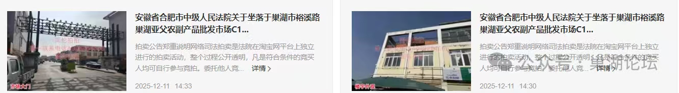 正文摘要:巢湖市裕溪路巢湖亞父農(nóng)副產(chǎn)品批發(fā)市場C4號、C6號、C9號、C12號、C16號、C18號樓的21處不動產(chǎn)被合肥市中級人民法院查封,上述不動產(chǎn)評估合計3982275元?,F(xiàn)因被執(zhí)行人未能全部履行已經(jīng)發(fā)生法律效力的本院(2019) ... |